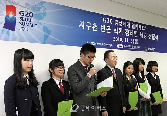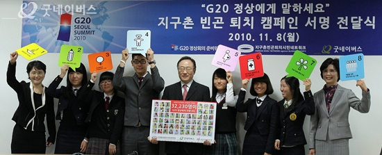 빈곤국가의 ‘개발 이슈’가 처음으로 포함된 서울 G20 정상회의를 3일 앞둔 지난 11월 8일(월), 우리 단체는 지구촌빈곤퇴치시민네트워크와 함께 전 세계 빈곤퇴치의 조속한 달성을 촉구하는 전국 32,230명 시민들의 서명과 사진(인증샷)을 G20에 전달했습니다.