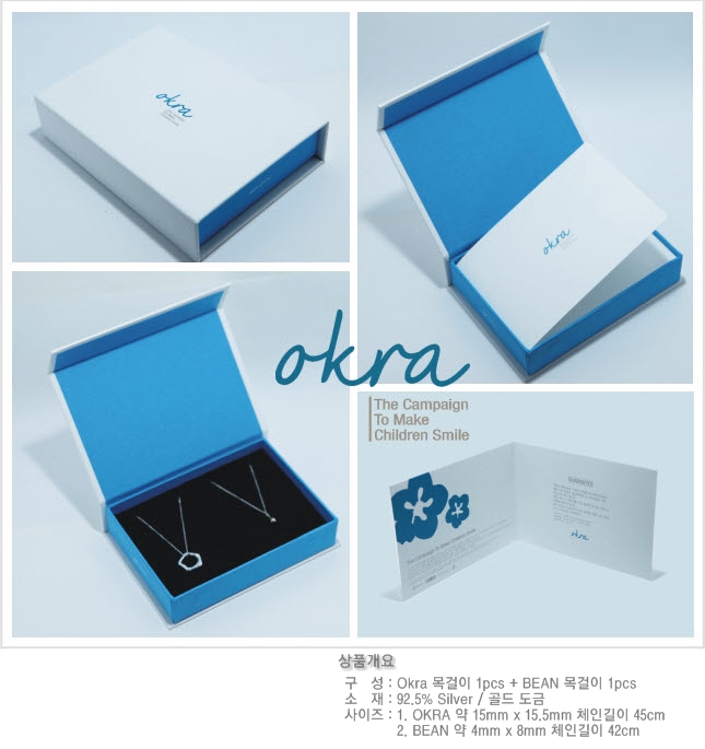 우리 단체는 기존의 머그컵, 티셔츠 등에 국한되어 있는 나눔 상품을 벗어나 실용적이면서 아름다운 나눔 상품을 제작하였습니다. 오크라 목걸이는 현대홈쇼핑이 후원하고 주얼리 브랜드 헤일렌, 손글씨&브랜드 디자이너 The 손지민에서 능력 나눔으로 함께 제작한 나눔 목걸이입니다.