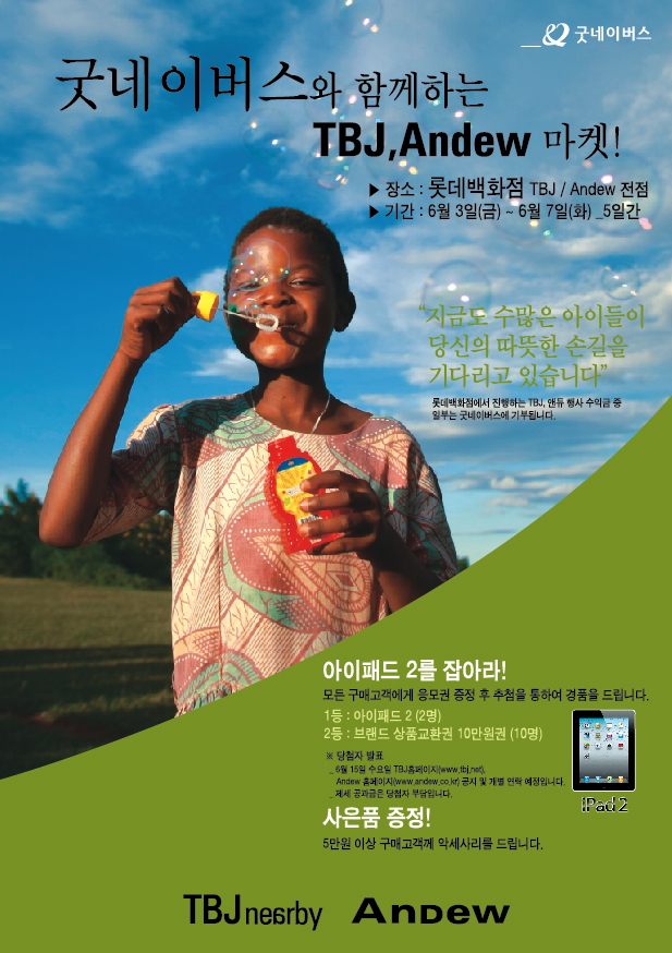 해외빈곤아동을 돕기 위해 기부행사를 진행하는 TBJ와 Andew 임직원들께 감사의 인사를 드리며, 앞으로도 굿네이버스의 해외구호개발사업에 많은 관심과 참여를 부탁드립니다.