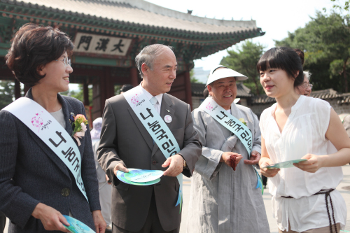 <출범식 후 진행된 거리행진에서 시민들에게 부채를 나눠주며 나눔국민운동본부의 취지를 알리는 보건복지부 진수희 장관과 굿네이버스 이일하 회장(왼쪽부터)>
