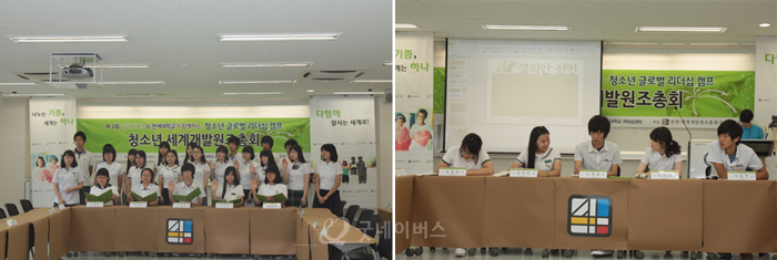 프로그램을 통해 참여 학생들의 마련한 빈곤문제 해결을 위한 구체적인 실천방안을 ‘송도 청소년 세계개발원조총회 선언’으로 작성하여 발표하는 시간도 가졌습니다. 작성된 각 조의 결의안을 모아 만든 최종 결의안은 11월에 있을 부산 세계개발원조총회에 제출할 예정이며, 캠프에 참여한 학생들은 개학 이후 전교생을 대상으로 빈곤퇴치 서명운동을 벌일 계획입니다.