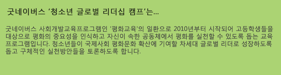 우리 단체의 ‘청소년 글로벌 리더십 캠프’에 앞으로도 많은 관심과 응원 부탁드립니다.