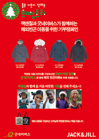 우리 단체는 11월 25일부터 12월 11일까지 의류업체 잭앤질(크리스패션 대표이사 우진석)과 함께 ‘굿네이버스와 함께하는 해외빈곤아동을 위한 기부캠페인’을 진행합니다.