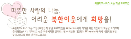이 프로모션은 지도, 길찾기 서비스를 제공하는 whereis 홈페이지(http://www.whereis.co.kr)를 통해 참여하실 수 있으며 유저들이 지도를 클릭 시 500원의 후원금이 적립됩니다.