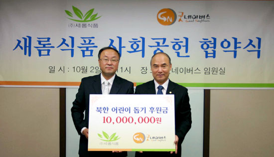 (주)새롬식품은 이날 협약을 통해 앞으로 북한 어린이 돕기 지원금을 위한 상품을 개발할 것임을 약정하며 1천만 원 상당의 대북지원기금 및 물품을 우리단체에 전달하였습니다.