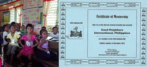 우리 단체 필리핀 지부는 필리핀 NGO 연합회의 18번째 구성원으로 참여하게 되었으며, 2015년 한 해 동안 필리핀 지부 산하 지역개발사업장에서 아동의 생종권, 보호권, 발달권, 참여권 등을 보장하고 이와 관련된 활동 내용과 현황을 보고할 예정입니다.