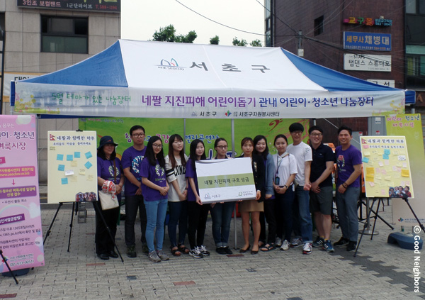 우리 단체 강남나눔인성교육센터(사무국장 차혜진)는 지난 5월 30일 서초구청(구청장 조은희)과 함께 네팔 지진 피해 돕기 기금 전달식을 진행했습니다. 이번 기금은 서초구청이 지난 5월 한 달간 매주 토요일에 진행한 서초토요벼룩시장을 통해 조성되었습니다.