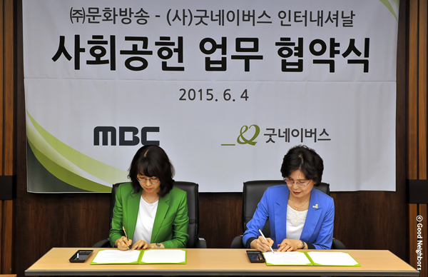 우리 단체는 지난 6월 4일 ㈜문화방송(대표이사 안광한)과 사회공헌 협약을 체결했습니다. 이날 협약식에는 굿네이버스 김인희 부회장과 ㈜문화방송 홍곤표 사회공헌실장이 참석하여 나눔 문화 확산을 위한 상호 협력체계 구축을 약속했습니다.