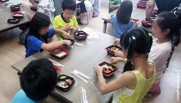 기부 받은 도시락 500개는 8월 3일 우리 단체 서울 지역 내 지역아동센터 아동들에게 전달되었으며, 아동들은 전달 받은 도시락으로 친구들과 함께 점심식사를 할 수 있었습니다.