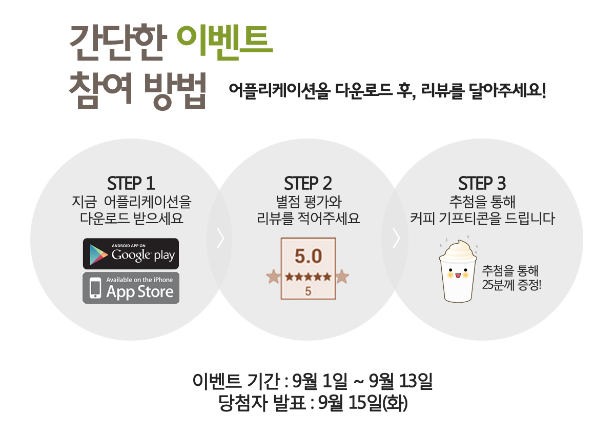 또한 업그레이드 된 모바일 앱을 신규 다운로드 혹은 업데이트 후 ‘앱스토어’와 ‘안드로이드 마켓’에 별점 평가와 리뷰를 남겨주시면, 추첨을 통하여 총 25분께 커피 기프티콘을 증정하는 ‘굿네이버스 앱 업그레이드 이벤트’를 진행합니다.