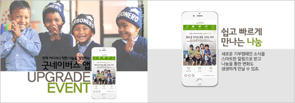 우리 단체는 모바일 환경에서 손쉽게 나눔을 실천할 수 있도록 돕는 ‘굿네이버스 모바일 앱(APP)’의 업그레이드 버전을 출시했습니다.