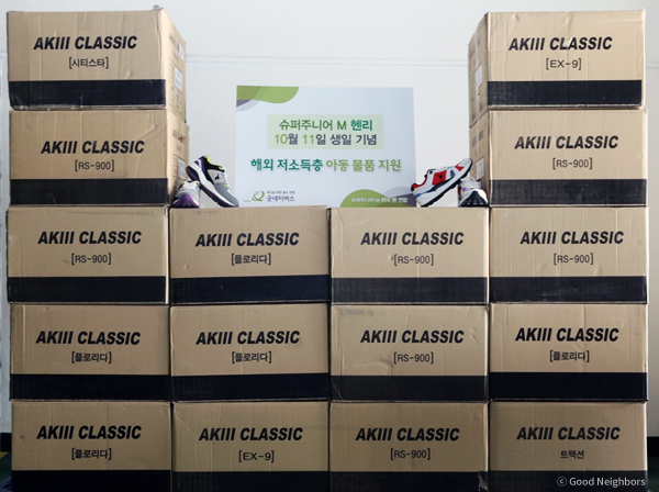 이날 전달받은 신발과 옷은 지난 9월부터 헨리가 모델로 활동 중인 라이프스타일 스포츠 브랜드 아키클래식의 제품으로, 타지키스탄의 빈곤가정 아동을 위해 전달될 예정입니다.