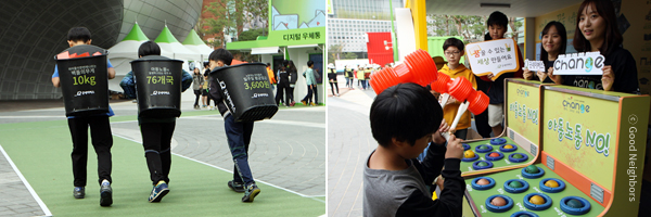 한편, 체험전 셋째 날인 24일(토)에는 필리핀, 차드, 말라위를 직접 방문해 봉사활동을 펼친 배우 고아라, 진세연, 서우가 함께하는 ‘체인져스 데이’가 진행됩니다. 3명의 ‘체인져스(Changers)’는 시민들과 함께 할 수 있는 바자회, SNS 이벤트, 프리허그 등 다채로운 나눔 행사에 함께합니다. 이들이 필리핀, 차드, 말라위에서 지구촌 아동에게 희망을 전하고 온 내용은 오는 12월 MBC 특집방송을 통해 방영될 예정입니다.
