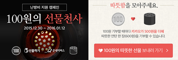 우리 단체는 지난 12월 30일부터 1월 12일까지 카카오(대표이사 임지훈)와 함께 난방비 지원캠페인 ‘100원의 선물천사’를 진행합니다.