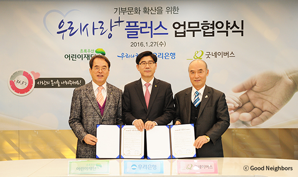 우리 단체는 지난 1월 27일(수) 우리은행 본점에서 우리은행(은행장 이광구), 초록우산 어린이재단(회장 이제훈)과 ‘기부문화 확산을 위한 우리사랑플러스 업무 협약’을 체결했습니다.