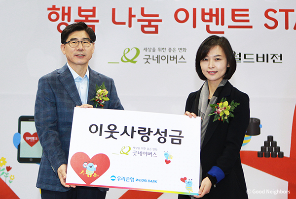 우리은행은 현장에서 ‘위비나눔 이벤트’를 진행해 이를 통해 모인 기부금 총 2억원을 우리 단체와 월드비전에 전달했습니다. ‘위비나눔 이벤트’란 금융권 최초 모바일 전문은행 애플리케이션인 ‘위비뱅크’와 SNS서비스인 ‘위비톡’을 고객들이 이용할 시 우리은행이 대신하여 기부금을 후원하는 사회공헌활동입니다.