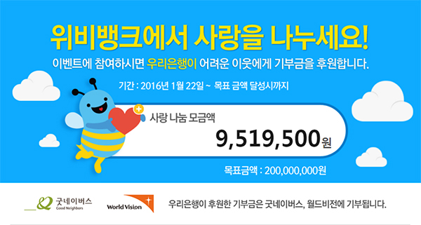 오는 6월 30일까지 ▷위비뱅크 설치 및 로그인 ▷위비모바일페이 이용 ▷위비톡 설치 ▷위비뱅크 내 사랑의 메시지 보내기 등을 통해서 ‘위비나눔 이벤트’에 참여가 가능하며, 참여 시 어려운 이웃에게 기부금이 전달됩니다.