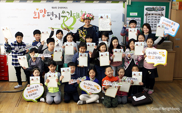 굿네이버스 희망편지쓰기대회는 나눔의 중요성을 알리고 세계시민의식을 함양하기 위해 2009년 시작된 대한민국 대표 나눔인성교육 프로그램입니다. 제8회 굿네이버스 희망편지쓰기대회는 어려운 가정 형편으로 학교에 가지 못 하고 카펫 공장에서 일을 하는 네팔의 수니타에 대한 영상을 가족이 함께 시청한 후, 수니타에게 응원의 메시지를 전하는 희망편지를 작성해 제출하는 방식으로 참여할 수 있습니다. 아동과 학부모가 함께 쓴 편지는 학교에 제출됨과 동시에 대회에 자동 참가신청 되며, 전국 심사를 통해 선정된 전국대회 수상자는 해외자원봉사활동을 통해 네팔의 수니타에게 직접 희망편지를 전달할 예정입니다.