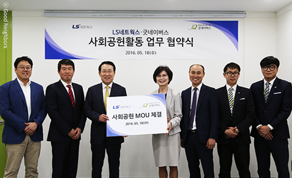 LS네트웍스 관계자는 “굿네이버스와의 업무협약을 시작으로 다양한 사회공헌 활동을 통해 나눔의 문화를 만들어 나가는 회사로 거듭나겠다”며 “LS네트웍스의 사회 공헌 비전인 ‘함께 꾸는 꿈, 더 큰 가치’를 실현하기 위해 실천하는 기업이 될 것”이라고 전했습니다.