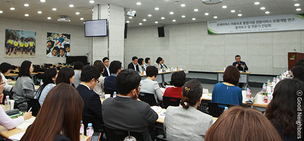 이날 보고회에는 아동보호 통합지원 전문서비스 모형개발 연구진 5명, 아동보호서비스 관련 전문가 15명, 굿네이버스 관계자 15명이 참석했습니다. 이봉주 서울대 사회복지학과 교수를 포함한 연구진 5명은 아동보호 통합지원 전문서비스 모형개발의 추진배경과 주요내용, 사업효과성 등을 발표했습니다. 이외에도 ▷아동보호 통합사례관리 매뉴얼 ▷원가정보호서비스 ▷심리상담 및 트라우마 치료 ▷가족재결합서비스에 대한 발표가 이어졌습니다.