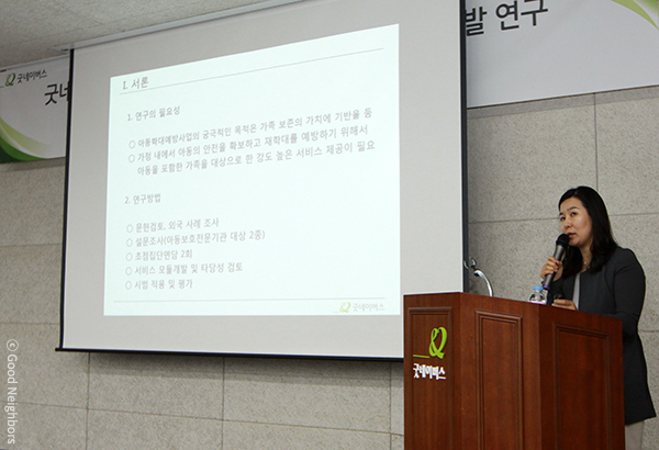 우리 단체는 지난 27일(금) 굿네이버스 회관에서 ‘굿네이버스 아동보호 통합지원 전문서비스 모형개발’ 연구결과보고회를 진행했습니다.