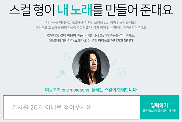 네티즌들은 ▶네이버 기부포털 해피빈에 접속해 ▶간단한 퀴즈를 통해 아이들의 어려움을 인지하고 ▶아이들에게 전하고 싶은 희망메시지를 작성해 캠페인에 참여할 수 있습니다. 작성된 희망메시지는 캠페인 종료 후 가수 스컬의 재능기부를 통해 노래로 제작될 예정입니다.