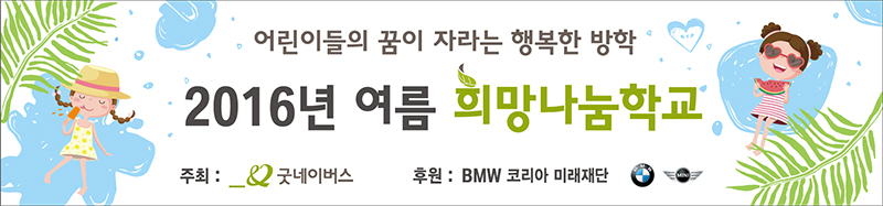 우리 단체는 BMW 코리아 미래재단(이사장 김효준)과 함께 25일부터 내달 5일까지 전국적으로 어린이들의 꿈이 자라는 행복한 방학 ‘2016년 여름 희망나눔학교’를 진행합니다.