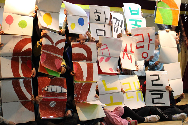 우리 단체는 빈곤가정 아동들이 겪는 심리‧정서적 문제가 대두됨에 따라 아동의 자아 존중감과 사회성 향상에 효과적인 그룹 활동 프로그램을 개발해 이번 희망나눔학교에 도입했습니다. 이는 미술과 연극치료를 접목한 통합 예술 프로그램을 활용한 것으로 전문심리치료사들이 개발 과정에 참여해 전문성을 높였습니다.