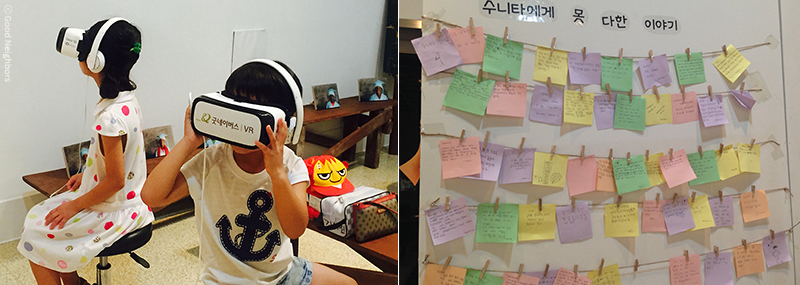 더불어 이번 전시회에는 VR(가상현실) 체험부스와 편지부스가 운영됐습니다. VR 체험부스에서는 우리 단체와 희망TV SBS가 아프리카에 설립한 희망학교를 VR영상을 통해 생생하게 체험할 수 있었습니다. 또한 희망편지쓰기대회에 참가하지 못한 시민들은 편지부스를 방문해 수니타에게 응원 메시지와 편지를 작성하기도 했습니다.
