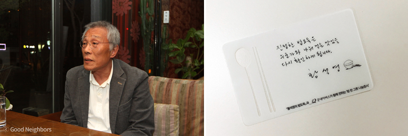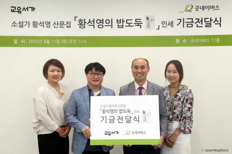 우리 단체는 지난 8월 11일 굿네이버스 본부에서 소설가 황석영의 에세이 ‘황석영의 밥도둑’ 인세 기금전달식을 가졌습니다.