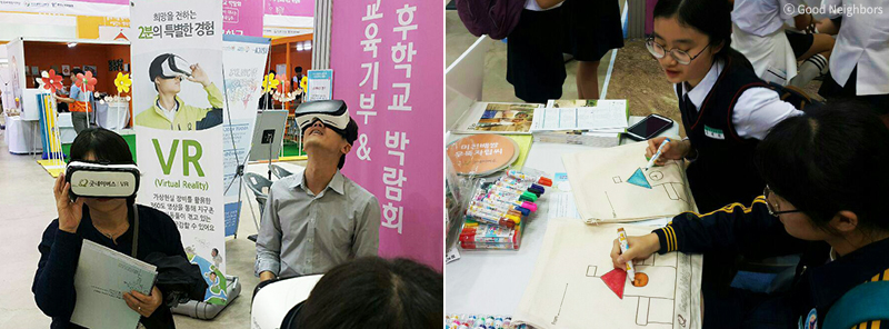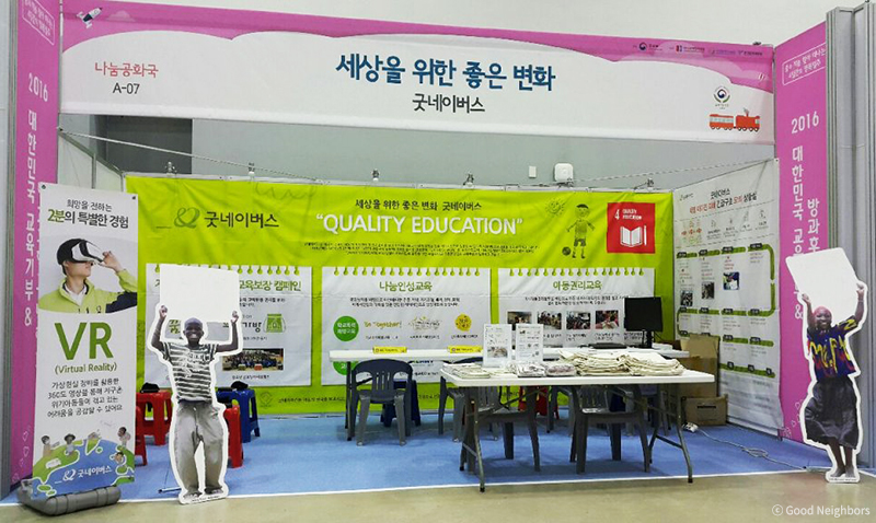 이번 박람회에서 우리 단체는 ‘QUALITY EDUCATION: 모두를 위한 포용적이고 공평한 양질 교육보장’이라는 주제로 체험 부스를 운영합니다. 굿네이버스 나눔인성교육, 아동권리교육 프로그램을 소개하고, 지구촌 친구들에게 전할 ‘희망가방만들기’와 아동노동반대를 위한 ‘꿈찌’ 제작 프로그램을 운영합니다. 또 우리 단체와 희망TV SBS가 아프리카 말라위에 공동 설립한 희망학교를 생생하게 체험할 수 있는 VR영상을 상영합니다.
