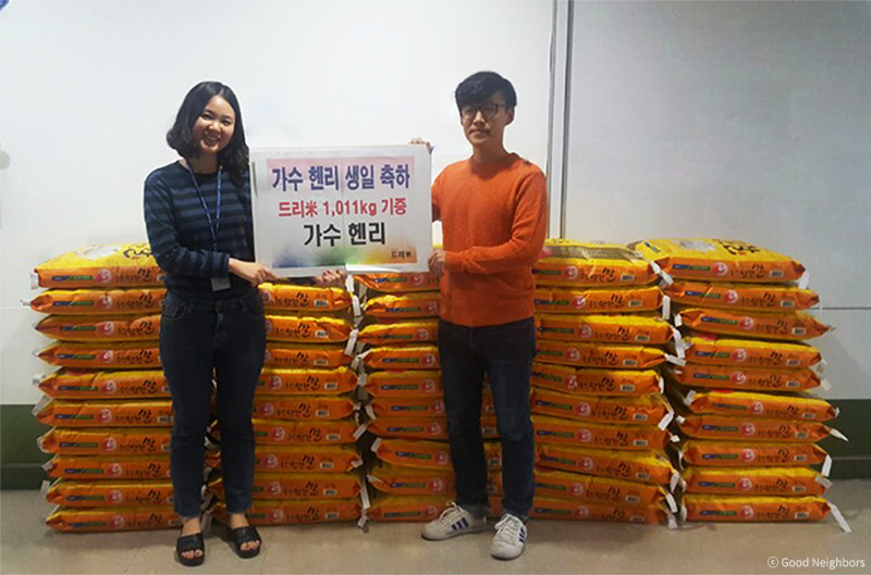 우리 단체는 지난 11일 슈퍼주니어-M 멤버 헨리의 팬클럽으로부터 쌀 1,011kg을 기부 받았습니다.