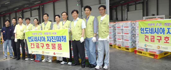 피복류와 상비약, 비누 장갑 등 일상 용품이 포함된 긴급구호 키트는 작년 7월에 포스코봉사단의 후원과 자원봉사 참여로 3,000개가 제작된 것으로 지난 여름 울릉도 태풍 피해와 10월 파키스탄 지진시에 각각 350개와 500개가 지원되어 이재민들에게 도움을 준바 있습니다.