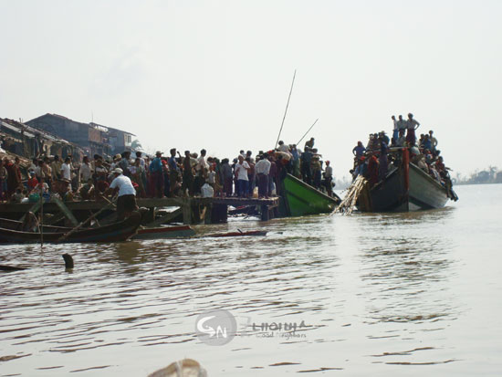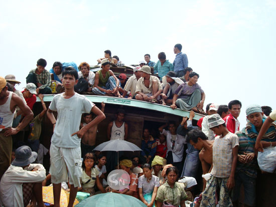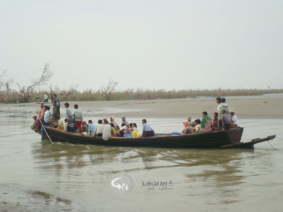 사이클론 나르기스에서 살아남은 생존자들로 가득찬 배가 안전한 지역으로 이동하고 있다.