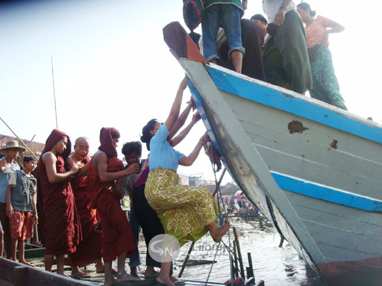 미얀마 라퓨타 지역 피해 주민들이 구호를 나선 승려들의 도움으로 배에 올라타고 있다.
