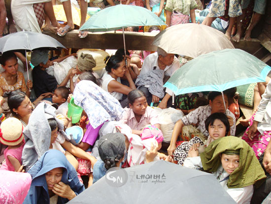 사이클론 나르기스에 살아남은 라퓨타 지역의 생존자들이 한 데 모여 구호물품을 기다리고 있다.
