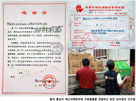 - 5월 19일(월) 현재 사상자 34,000명, 부상자 2백만명 이상(출처: OCHA)으로 집계되고 있는 중국 쓰촨성 대지진 현장에 파견된 우리단체 긴급구호팀은 지난 5월 20일(수) 청두시의 홍십자(중국 적십자) 재난대책본부에 물, 식료품 등의 구호물자를 전달함.