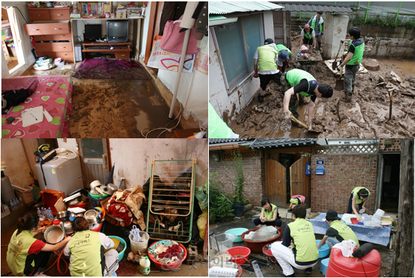 7월 30일에는 1차 긴급지원으로 동두천시 침수피해 가정과 용인시 모현면 산사태 피해지역 가정에 식수, 의류, 생필품 등 1300만원 상당의 긴급구호 물품을 전달하였으며, 인력 90명을 투입하여 침수가구를 청소하고, 도배 봉사를 진행하는 등 수해복구 작업을 진행하였습니다.