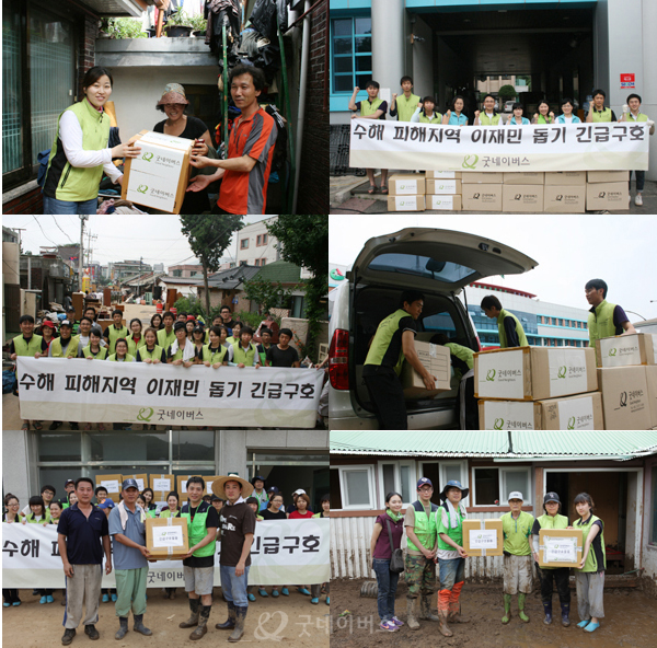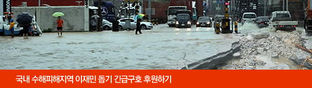 전국 44개 지부를 통해 위기가정 지원을 위한 전문복지사업을 수행하고 있는 굿네이버스는 이번 비 피해로 고통 받고 있는 수해피해지역의 이재민들을 돕기 위해 홈페이지를 통해 긴급구호 모금 캠페인을 진행하고 있습니다.
