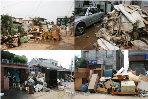 경기북부지역은 긴급구호 실시 이후 다행히 추가피해는 없었지만, 전자제품과 같은 침수물 의 수리가 필요한 것으로 조사되었습니다. 경기용인지역은 인근 군부대에서 추가복구작업을 실시하였으며 산사태로 피해를 입은 20가구의 토사물 제거 작업을 끝낸 상태입니다.