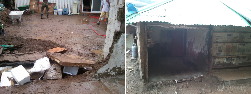 용인시 매산리에 거주하는 김지은(가명)양은 굿네이버스가 방학동안 저소득가정 학생들을 대상으로 실시하는 방학교실인 '영 파워 스쿨' 프로그램에 참여하기 위해 집을 비운 사이에 산사태가 발생해 심각한 피해를 피할 수 있었습니다. 김 양은 “교복과 책가방이 없어져서 너무 슬프다"며 ”빨리 잘 정리가 되어서 ’영 파워 스쿨‘에서 선생님과 친구들과 함께 공부하고 싶다“는 말을 전했습니다.