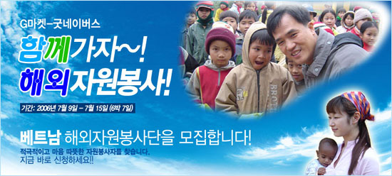 우리단체는 제14회 사랑의 동전모으기 ‘100원의 기적’ 실천활동으로 G마켓과 함께하는 베트남 해외봉사단을 모집하고 있습니다. 베트남 하노이에 위치한 굿네이버스 베트남지부를 통해 지역사회 아동과 주민들을 위한 여러 교육 프로그램을 진행할 예정이며, 낙후시설개보수, 식수개발지원, 한글교실 봉사활동을 기획 중입니다. G마켓과 굿네이버스 회원이면 누구나 신청 가능한 이번 해외봉사프로그램에 도전과 봉사정신을 갖고 계신 분들의 많은 참여를 바랍니다.