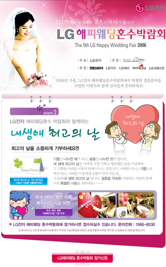 우리 단체는 8월 26일, 27일 양일간 LG전자 2006 해피웨딩 혼수박람회와 함께 학여울 무역전시장에서 예비 신혼 부부 3,000쌍을 대상으로 “내생애최고의날” 기쁜 나눔캠페인을 실시합니다.