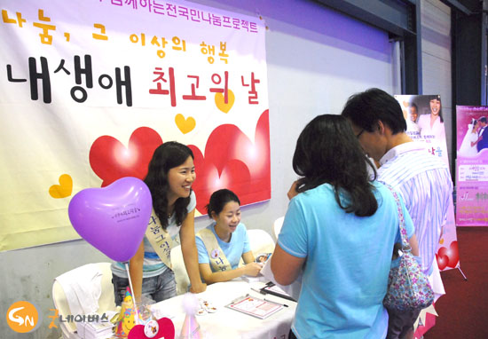 우리단체는 8월 26일부터 27일까지 양일간에 걸쳐서 진행된 LG해피웨딩혼수박람회에서 "내생애최고의날" 행사를 진행하였습니다. 결혼을 앞두거나, 결혼에 관심이 많은 사람들이 연인과, 가족들과 함께 웨딩혼수박람회에 많이 방문해 주셨습니다. 그중 많은 분들이 연인과 만난 날, 결혼 할 예정일 등을 자신의 최고의 날로 선정하여 "내생애최고의날" 기부 프로그램에 참여해 주셨습니다. "내생애최고의날"에 참여하신 분들은 기부하기로 한 최고의 날 사연을 적고, 플로라이드 사진을 찍으면서 행사에 참여한 것을 기념을 하기도 했습니다.