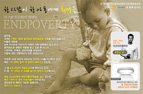 우리단체는 옥션(http://www.auction.co.kr)과 함께 지구촌 빈곤퇴치를 위한 화이트밴드 캠페인을 펼이고 있습니다. 화이트밴드 캠페인은 지구촌의 빈곤문제 해결을 위해 전세계적으로 펼치고 있는 캠페인으로 국내에서는 20여개 시민단체가 함께하는 지구촌빈곤퇴치시민네트워크가 주도하고 있습니다.