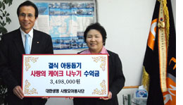 대한생명(대표이사 신은철)은 지난 11월 1일(수) 우리단체 결식아동들을 위한 성금을 기탁하였습니다. 창립 60주년을 맞은 대한생명은 지난 10월 10일부터 20일까지 자원봉사대축제 행사를 진행하면서 그 첫 행사로 결식아동돕기 ‘희망의 사과나무 만들기’를 진행하였습니다. 행사에 참여한 대한생명 임직원들이 케익, 쿠키 등의 다과를 구입하고 그 수익금으로 결식아동들에게 도움을 주고자 우리단체에 기부한 것입니다. 후원하여 주신 대한생명 임직원 여러분께 깊은 감사의 마음을 전합니다.