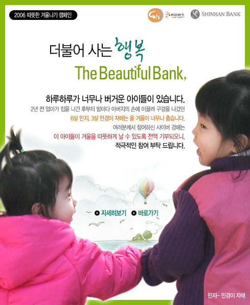 우리단체는 신한은행과 함께 2006년 11월 20일부터 12월 20일까지 한 달 동안 신한은행 사회공헌 홈페이지에서 소외아동 및 결식아동 후원을 위한 “따뜻한 겨울나기” 캠페인을 진행합니다.