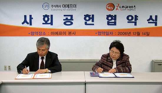 유아복 및 유아용품 전문 기업 이에프이(해피랜드, 대표 임용빈 www.happyland.co.kr)는 우리단체에 2007년 1년간 해피랜드 유아복·용품을 제공하고 판매수익금을 사회복지기금으로 기부하는 협약을 체결하였습니다.