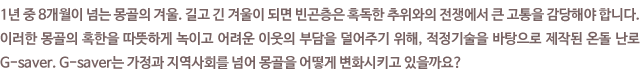 겨울철 난방 효율도 높이고 대기오염을 감소시키며 일석이조의 역할을 해내는 G-saver. 현지의 재료로 주민들이 직접 만들어 보급한다는 점에서 몽골의 지속가능한 개발에 큰 영향을 주고 있습니다. 소외된 이웃에게 일시적인 수혜가 아닌 지속가능한 변화를 선사하고자 하는 굿네이버스의 열정은 G-saver의 열기만큼이나 뜨겁습니다. 몽골에 찾아온 이 따뜻한 변화가 더불어 사는 세상으로 가는 힘찬 걸음이 되기를 바랍니다.
