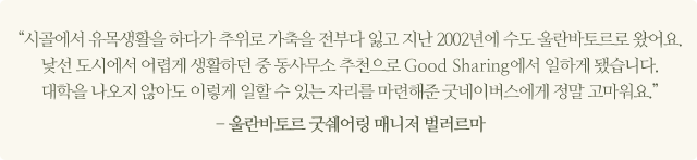 G-saver의 생산과 보급을 위해 굿네이버스는 지난 2010년 9월 현지에 굿쉐어링(Good Sharing) 공장을 설립했습니다. 공장이 설립되면서 G-saver는 본격적으로 주민들에게 보급되기 시작했습니다. 제조업 기반이 약해 일자리가 부족한 몽골에서 Good Sharing은 사회적기업으로써, 특히 도시 이주민에게 안정적인 일자리를 제공하는 역할을 합니다. 현재 울란바토르 공장과 자브항 공장에는 생산직, 보급직, 행정직을 합쳐 90여 명의 현지 직원들이 근무하고 있습니다.